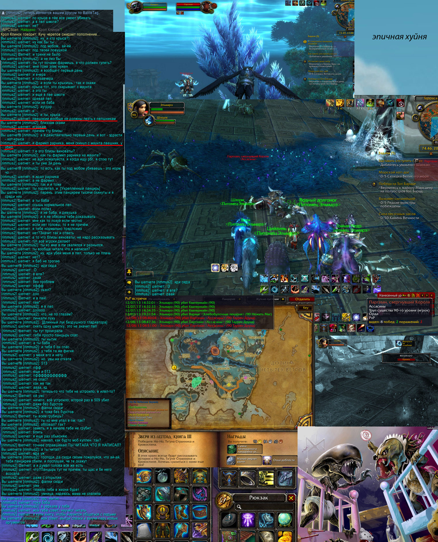 Магистр Ракообразных писал(а):Я ,в отличии от своего товарища который уже давно продал душу ПВЕ контенту, делаю упор исключительно на ПВП. Любое ПВП. Арены, РБГ, Ворлд ПВП... да боже мой... хоть на Гурубаши. лишь бы можно было кого-нибудь по пинать, а потом подугареть рескиля неудачника.