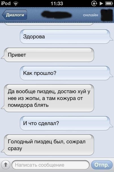 Мужик начинает делать ей куни... Тут, хуяк, в рот какая-то ебатень попадает. Он ее из пасти вынимает, пытается рассмотреть. Не видно нихуя, откидывает и дальше давай... Раз, опять кусок какой-то жратвы как будто. Откидывает. Раз, опять язык за что-то цепляется. Шкурка походу помидорная. Глаза привыкают к темноте, мужик смотрит на объект своих ласк, не выдерживает, и его выворачивает прямо туда с характерным БУУЭЭЭЭЭ!!!1111.