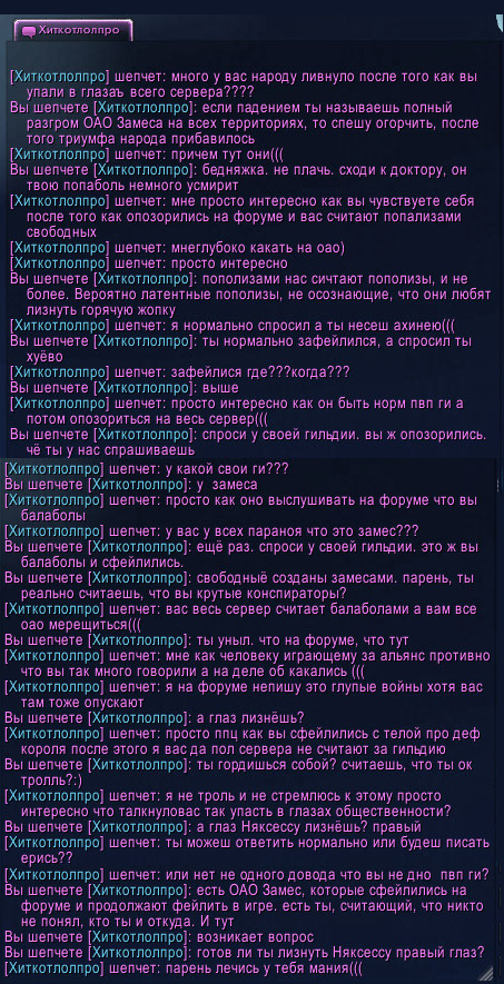 помнится когда ещё на седогриве играли один пьяный дурик(не буду показывать пальцем на Енилузина) раз пять СЛУЧАЙНО проспамил наш РК в чат на острове завоевания